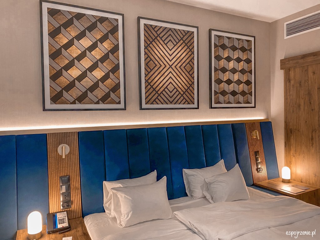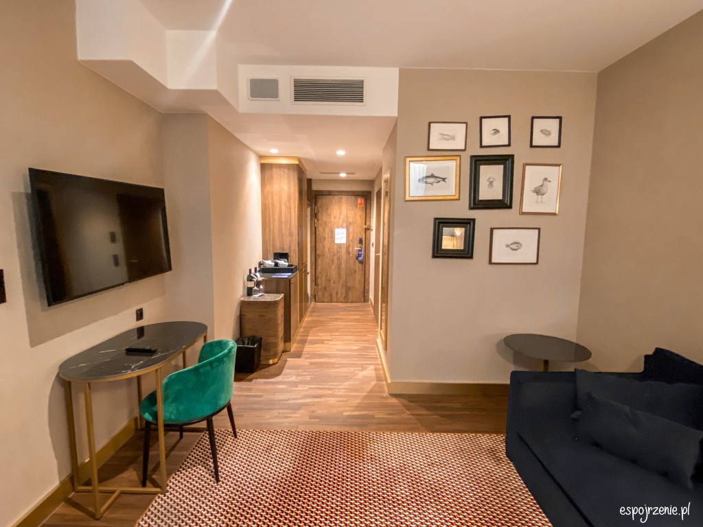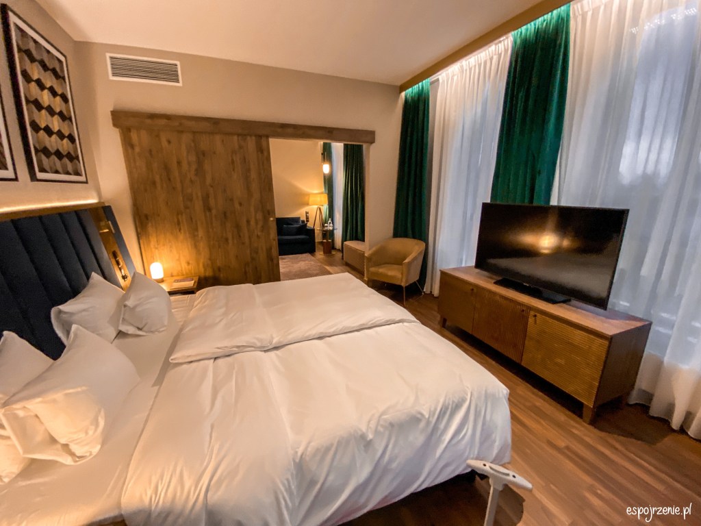 Dzięki uprzejmości hotelu oraz członkostwu w Radisson Rewards zostałam upgradowana z pokoju standardowego do Apartamentu Suite. Warto wspomnieć, że w hotelu mamy pokoje podzielone na wiele wariantów. Przede wszystkim mamy pokoje bez balkonu jak i te z balkonem. Bez balkonu to te skierowane w stronę morza. Jako, że hotel nie leży w pierwszej linii to Bałtyk jest widoczny ale nie jest to widok spektakularny jak np. z położonego w pierwszej linii i widocznego z okien hotelu Marriott. Pokoje z balkonem posiadają widok na przepiękny ogród z drugiej strony hotelu jak i zewnętrzną strefę SPA. Rezerwując pokój możemy wybierać od pokoju standardowego, poprzez pokój superior oraz apartament junior aż po apartament suite, premium czy prezydencki. Apartament Suite miał 42 metry kwadratowe oraz posiadał jedną łazienkę, osobną sypialnię i pokój dzienny. Wszystko utrzymane w kolorze szmaragdowym z dodatkiem złota czy marmuru.
