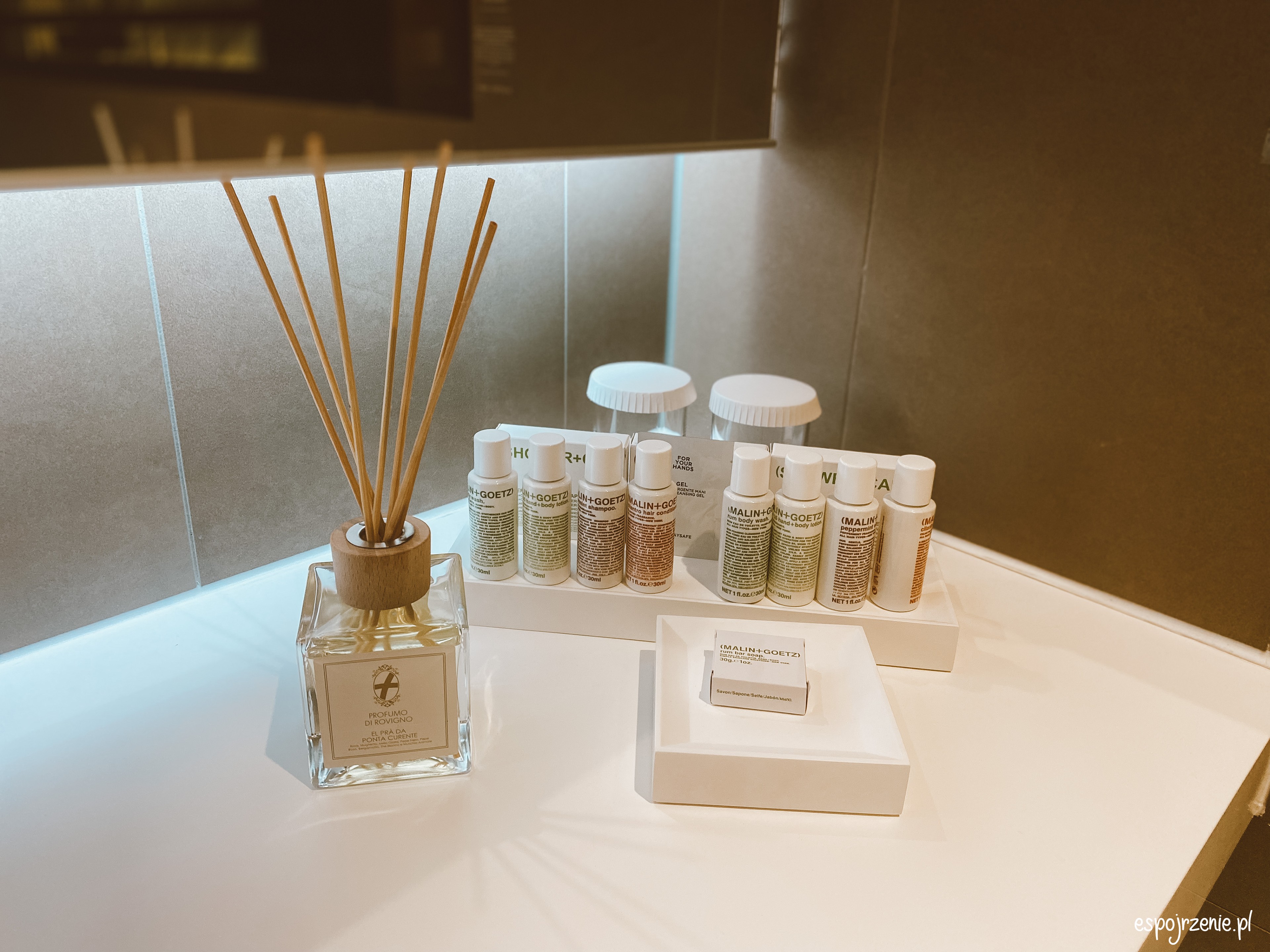 W łazienkach znajdują się mini kosmetyki firmy Malin + Goetz. Jest to nowoczesna apteka usytuowana w nowojorskiej dzielnicy Chelsea. Marka stworzona w 2004 roku. Nowoczesne technologie, brak barwników i sztucznych aromatów – to cechy Malin + Goetz. Kosmetyki przeciwdziałają nadwrażliwości, podrażnieniom i alergiom.