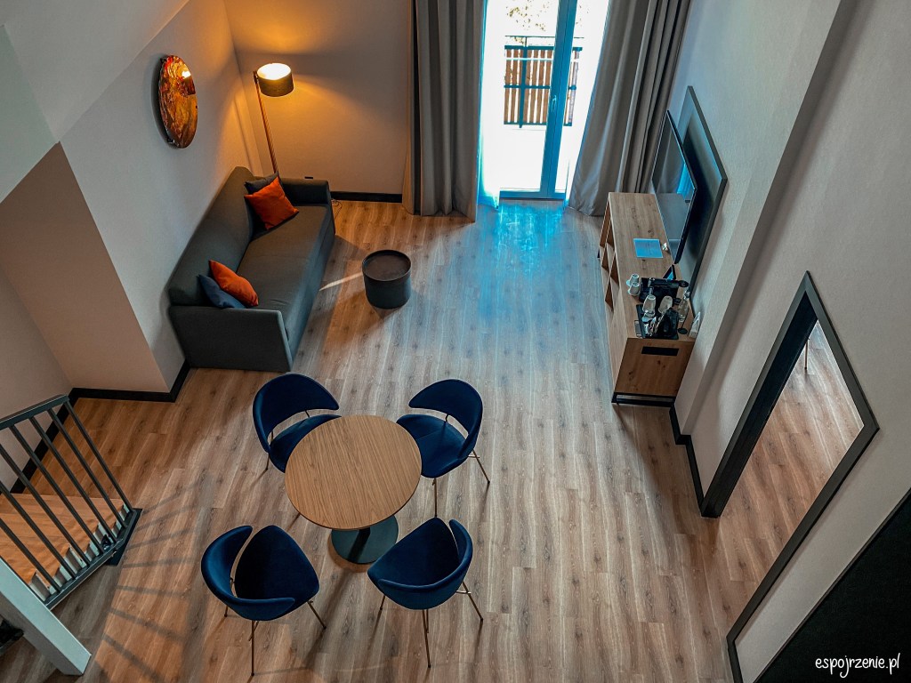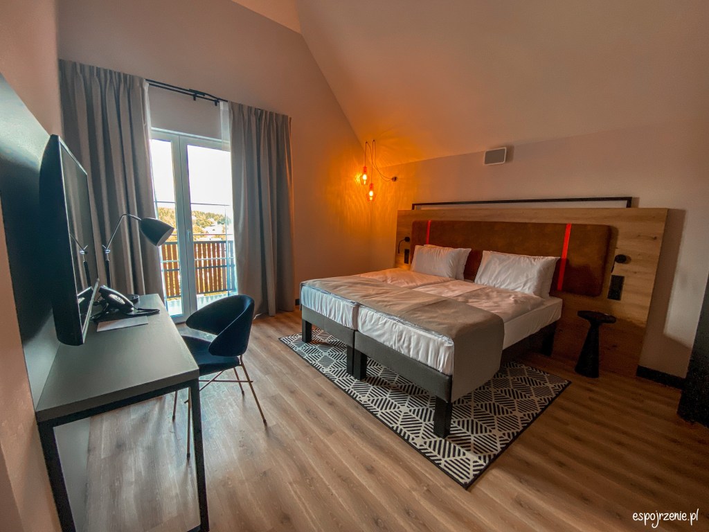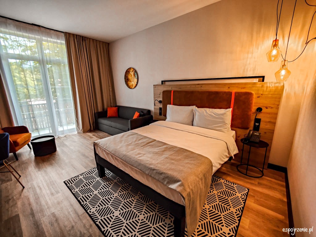 Bardzo duży plus za przestronne pokoje utrzymane w loftowym stylu, przełamane dekoracjami ze szkła oraz pomarańczowymi dodatkami. Pokoje są bardzo przestrzenne, dzięki nieco wyższemu sufitowi. Klimatu dodają stylowe okna, które mogą kojarzyć się z przedwojennymi willami, podobnie jak i elewacja Hotelu nawiązuje do tego charakteru. Dla dzieci przygotowano bezpłatnie łóżeczko. Poniżej rodzaje dostępnych pokojów: