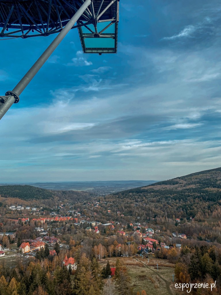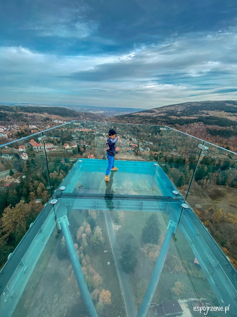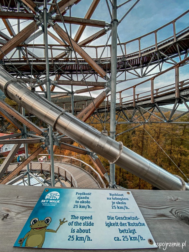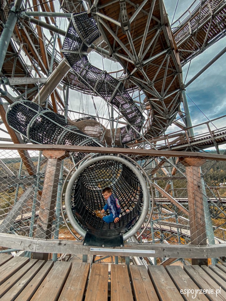Sky Walk, czyli liczącą sobie 62 metry wysokości wieże, długość chodnika to 850 metrów. Na samym szczycie ładny widok na okolicę, szczególnie jesienią oraz przeszklona platforma wraz z siatkowaną powierzchnią nad przepaścią 😊 dla dzieci od 120 centymetrów wzrostu dodatkowo płatna zjeżdżalnia albo dla pozostałych siatkowane tunele.