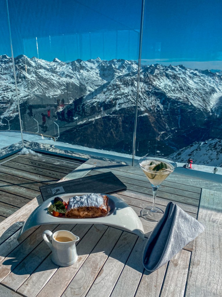 Ice Q – wizytę w Elements 007 warto połączyć z przerwą w restauracji Ice Q. Składa się ona z dwóch części: resturacyjnej (rezerwacja wymagana) oraz loungu. Lounge (czesc wewnętrzna oraz taras zewnetrzny przy dobrej pogodzie) zapewnia przepiękne widoki na szczyty górskie jak i możliwość wypicia drinka agenta 007 Vesper Martini. Menu obejmuje kilka pozycji na lunch albo deser. Jeśli chodzi o część resturacyjną Ice Q to rezerwacja jest wymagana, można ją zrobić uprzednio przez Internet gdzie wybieracie też rodzaj menu. Niestety stolika przy oknie nie da się zarezerwować, są przydzielane losowo. W Ice Q organizowane są również kolacje wieczorową porą, które również podlegają rezerwacji. Sama bryła restuaracji, która zagrała w Spectre robi wrażenie. Konstrukcja ze szkła i stali lśni w alpejskim słońcu.