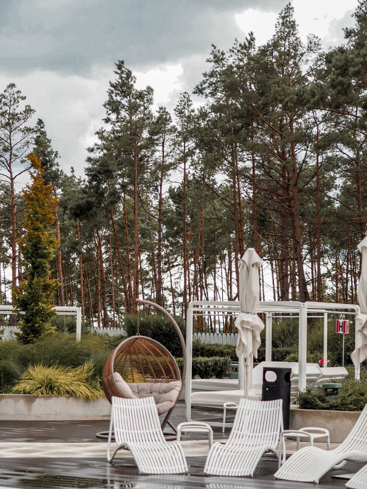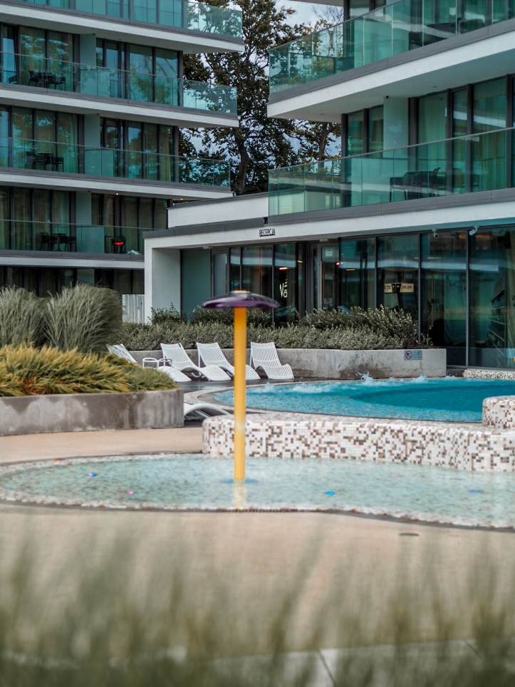 Część basenowa znajduje się w budynku B (w tym samym miejscu również recepcja). Basen dzieli się na wewnętrzny oraz zewnętrzną część do której bezpośredni dostęp jest również z patio – jest to dość wygodne rozwiązanie w sezonie letnim. Dodatkowo dla dzieci przygotowano dwa brodziki – jeden jest wewnątrz, a drugi na zewnątrz. Dla dorosłych jest strefa saun oraz dwa jacuzzi, jedno sporo wewnętrzne, a drugie mniejsze ulokowane po drugiej stronie basenu na zewnątrz.