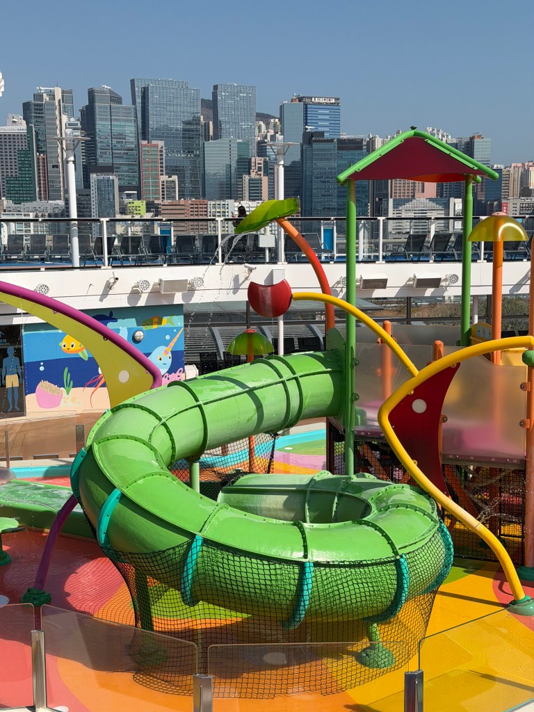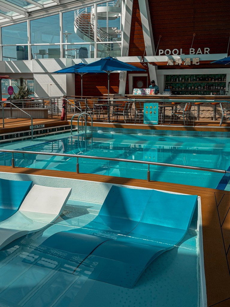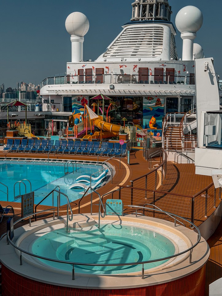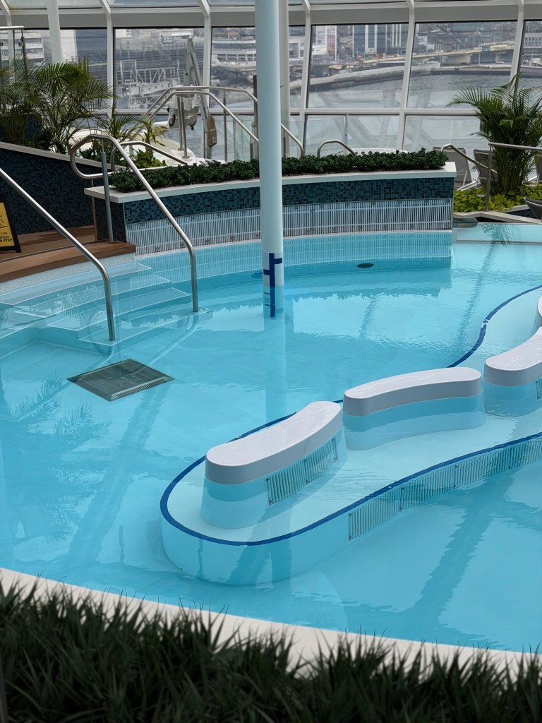 Na statku jest też siłownia, SPA, basen wewnętrzny, zewnętrzny wraz z małym Aquaparkiem dla najmłodszych. Znajdziemy tu także strefę relaksu z jacuzzi oraz małym basenem tylko dla dorosłych.