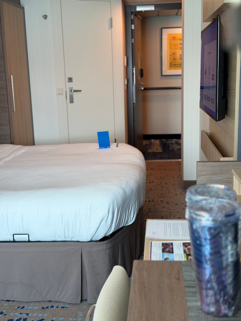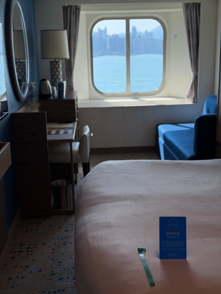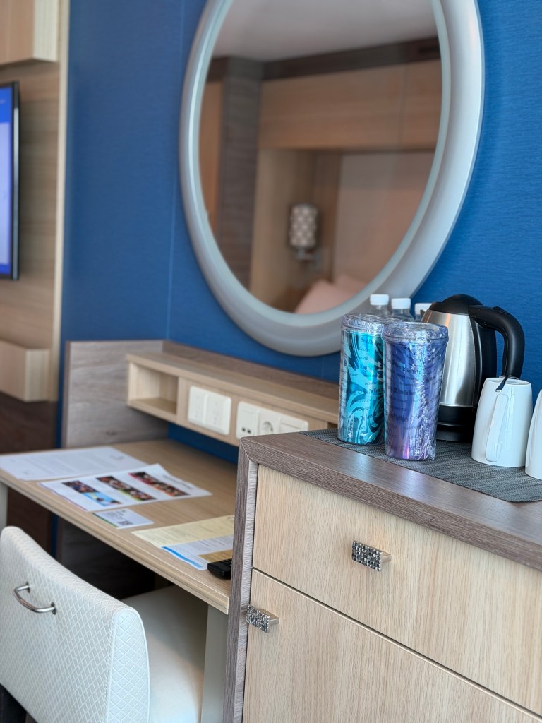 Od wewnętrznych po apartamenty, rozpiętość jest wielka. My pływaliśmy już w kajucie wewnętrznej czy z balkonem, a tutaj po raz pierwszy z oknem i byłam miło zaskoczona jej wielkością. Na plus czajnik, więc nie trzeba chodzić do restauracji jeśli chcemy napić się herbaty. Dodatkowo dostajecie wielorazowy kubek na wodę w fantazyjnych kolorach z logo armatora.
