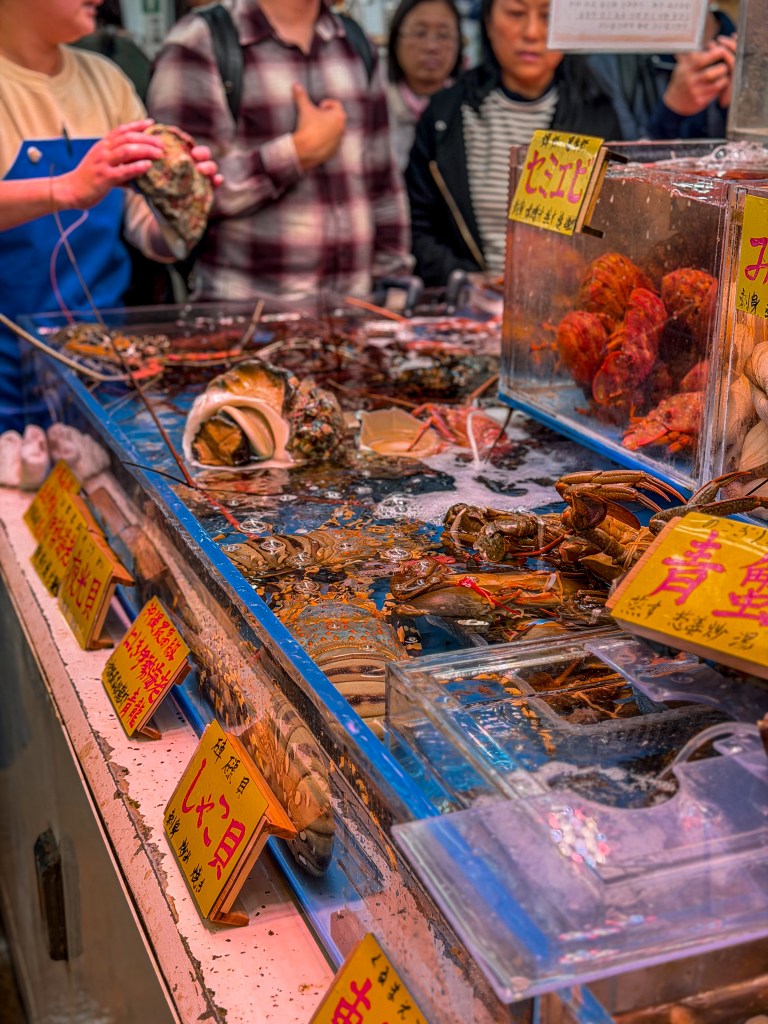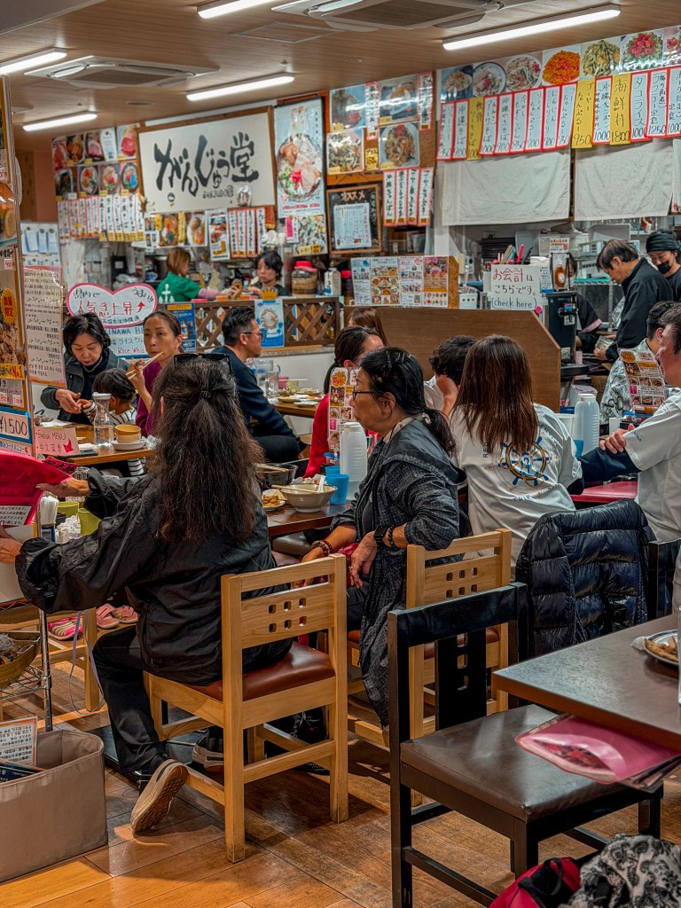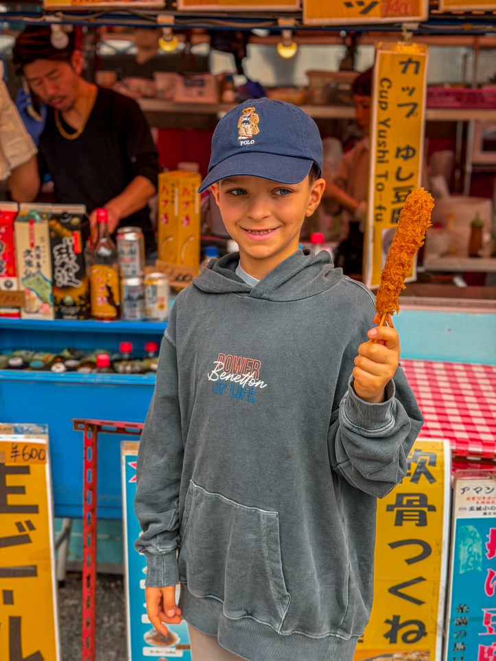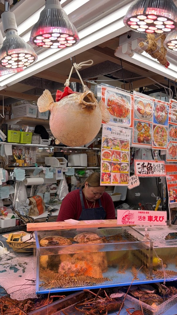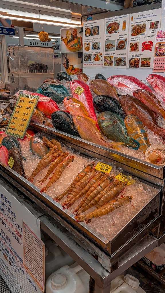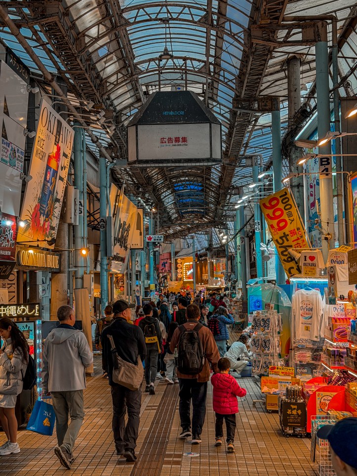 Będąc na Kokusaidori warto wejść w boczne uliczki, albo zadaszone uliczki handlowe zwane jako ‘Shotengai’. To tutaj natknęliśmy się na market z rybami, a na górze z bardzo lokalnymi restauracjami.