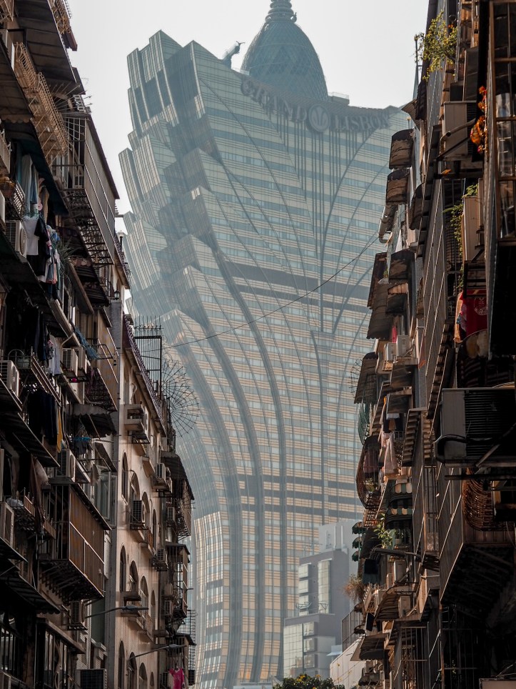 Grand Lisboa znajduje się na Półwyspie Macau, relatywnie blisko starówki.